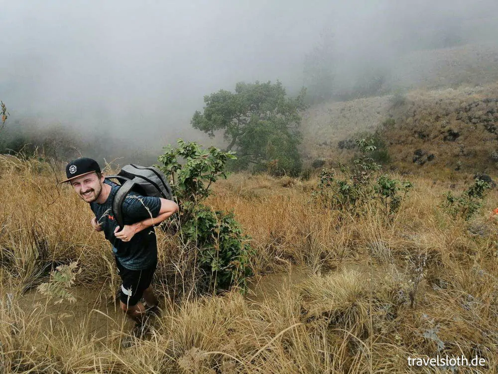 A medida que la pareja ascendía más allá de la Posición 3, el paisaje comenzó a transformarse. La jungla densa dio paso a una sabana abierta, donde las hierbas se movían al compás de la brisa fresca. La temperatura bajó notablemente, ofreciendo un alivio bienvenido del calor anterior. Pero el alivio fue breve, ya que el sendero se empinó dramáticamente. El último empujón hasta el Borde del Cráter fue la parte más desafiante del día, con grava volcánica suelta que dificultaba mantener el equilibrio.