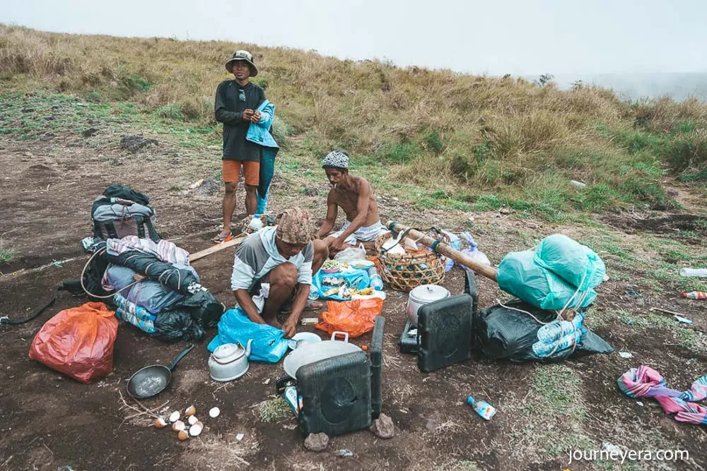 Au fil de l’après-midi, le sentier a révélé sa diversité. Des forêts denses ont laissé place à des canyons rocheux, où des singes curieux les observaient depuis le dessus. Jackson s’est émerveillé de la façon dont le terrain était inattendu et luxuriant—loin du paysage volcanique stérile qu’il avait imaginé. La dernière portion les a conduits à leur campement sur le bord du cratère à 2 639 mètres. Bien que l’endroit soit entaché par des déchets, les vues sur le lac Segara Anak et le cône volcanique du Gunung Barujari étaient à couper le souffle.